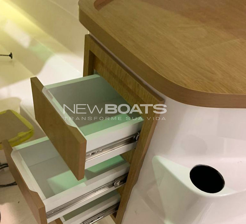Marcenaria interna com armários e gaveteiro em Teca